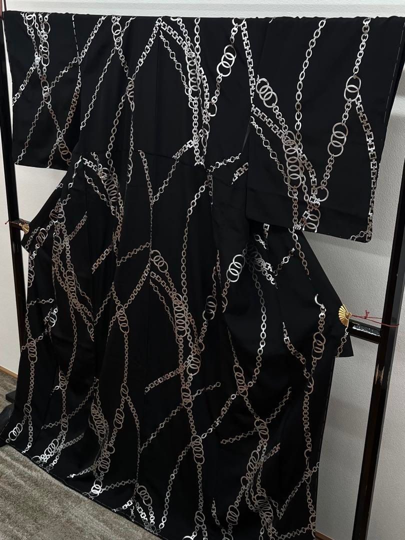 小紋 シルバーチェーン柄 個性的 正絹 黒地 躾糸付き WWW_NICORILABO_COM
