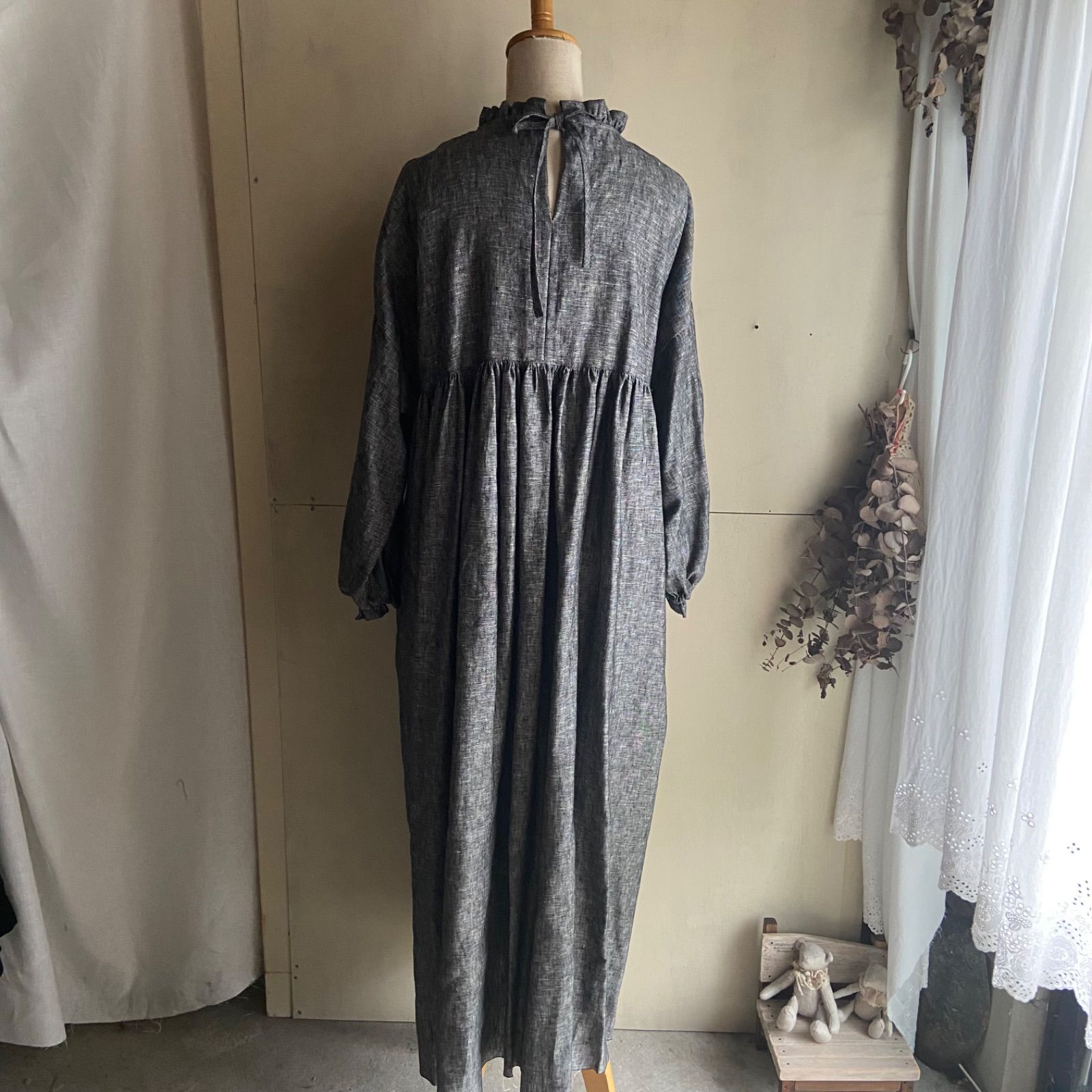 リネンワンピース フリルレースギャザーワンピース タックワンピース リネンシャンブレー グレー 身幅ゆったりの検索結果