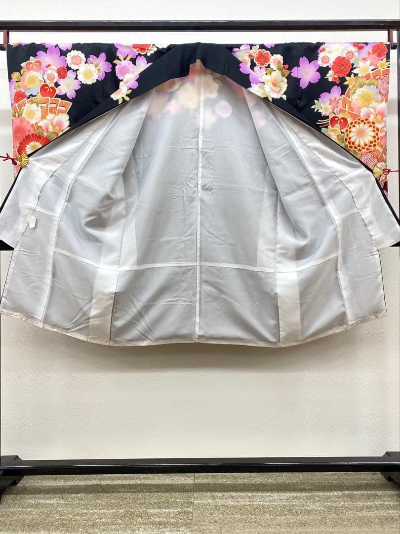 I◆着物くつろぎ 振袖 襦袢セット かわいい花模様 金彩 金駒刺繍 桜 菊 扇 小花 赤色 袷 正絹 成人式 着物 身丈166.5 裄68