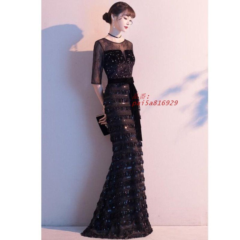 ドレス 大人 ピアノ 発表会 ロングドレス 大きいサイズ 演奏会用ドレス 長袖 母親 ロング黒 披露宴 結婚式 演奏会 袖付き レディース kni5a575189