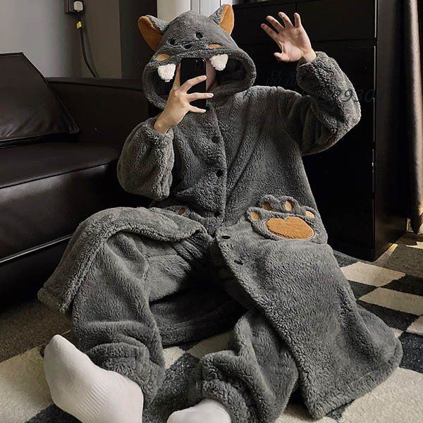 ルームウェア もこもこ パジャマ 羊 狼 冬 ナイトガウン 長袖 部屋着 着る毛布 あったか 前開き 暖かい フード付き 寝巻き kni5a329304 WWW_NICORILABO_COM