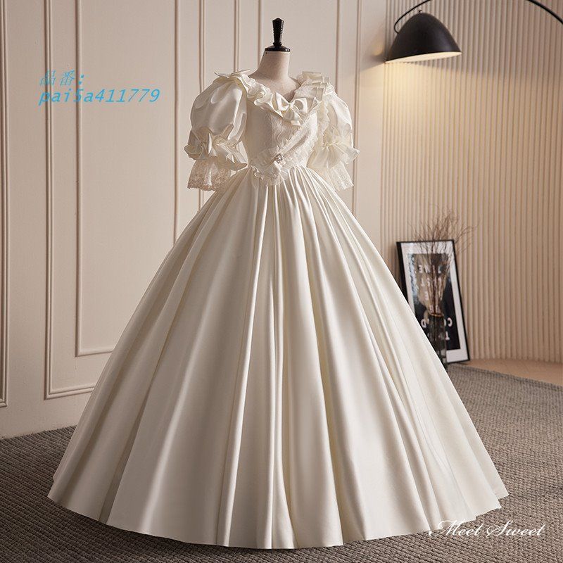 ウェディングドレス ロングドレス プリンセスドレス レトロ Aラインドレス 半袖 ウエディングドレス 結婚式 ブライダル サテン 花嫁 前撮り 上品 二次会 pai5a854632