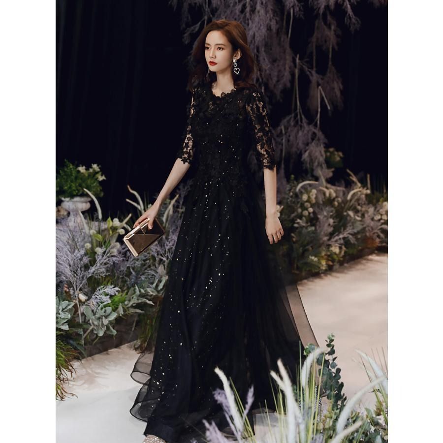 ブラック ワインレッド 5分袖 ロングドレス 演奏会 発表会 大人 パーティードレス ファスナー レース カクテルドレス フォーマル WWW_NICORILABO_COM