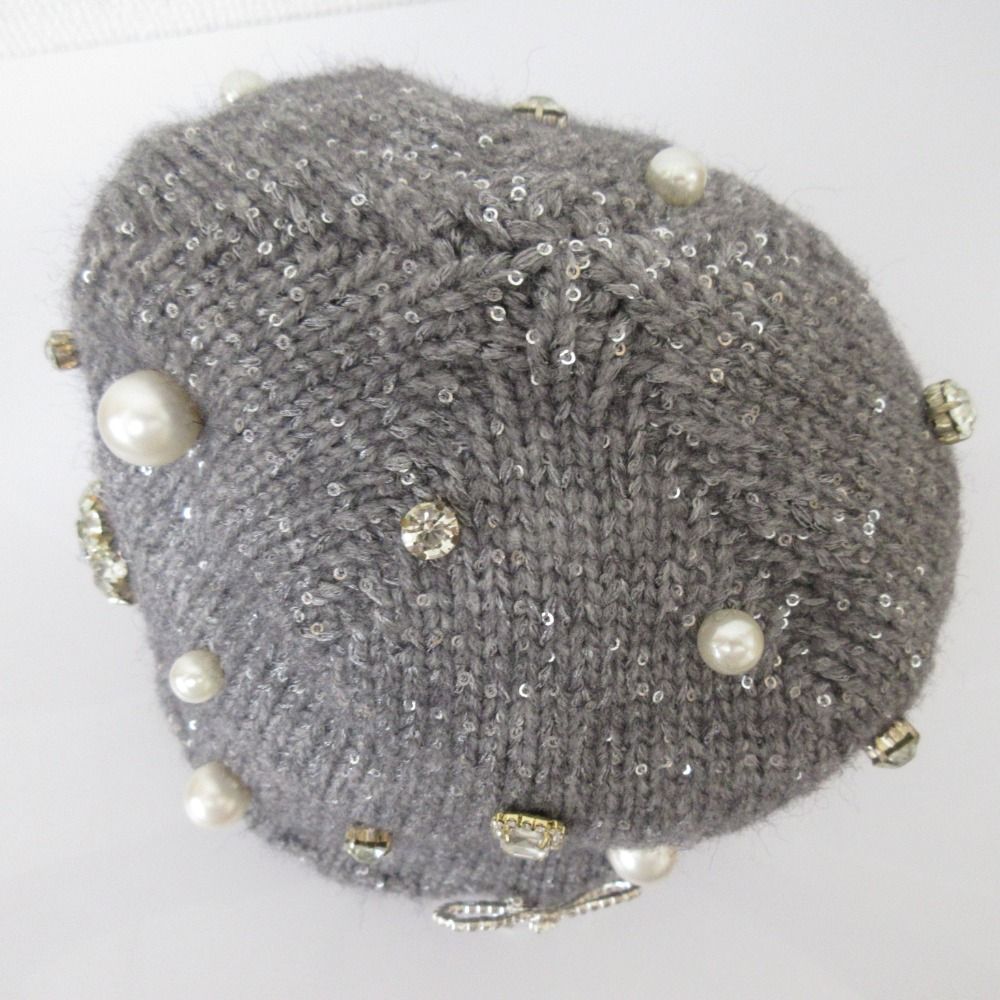 maison lulu pinot メゾンルルピノー Pearl bijou knit cap パール ビジュー ニット キャップ 帽子 グレー レディース 古着 WWW_NICORILABO_COM