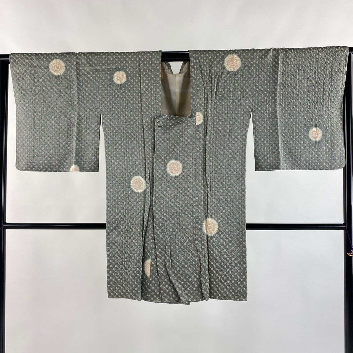 道行 身丈92cm 裄丈66cm M 和装コート 角衿 幾何学模様 地紋 絞り 灰緑 正絹 秀品の検索結果