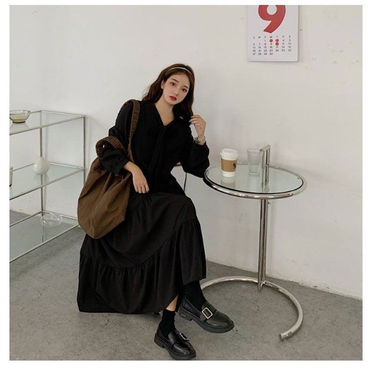 長袖 レディース 無地 かわいい ロング丈 Aライン シンプル デート 着?せ カジュアル ワンピース 体型カバー リボン ボウタイ ネック 膝下丈 ミモレ丈 きれいめ 大人女子 フ おしゃれ cjfj145380 WWW_NICORILABO_COM