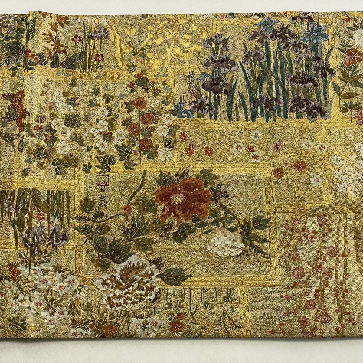 丸帯 名品 日本屏風絵大観 草花 鳥 箔 金色 お太鼓柄 正絹