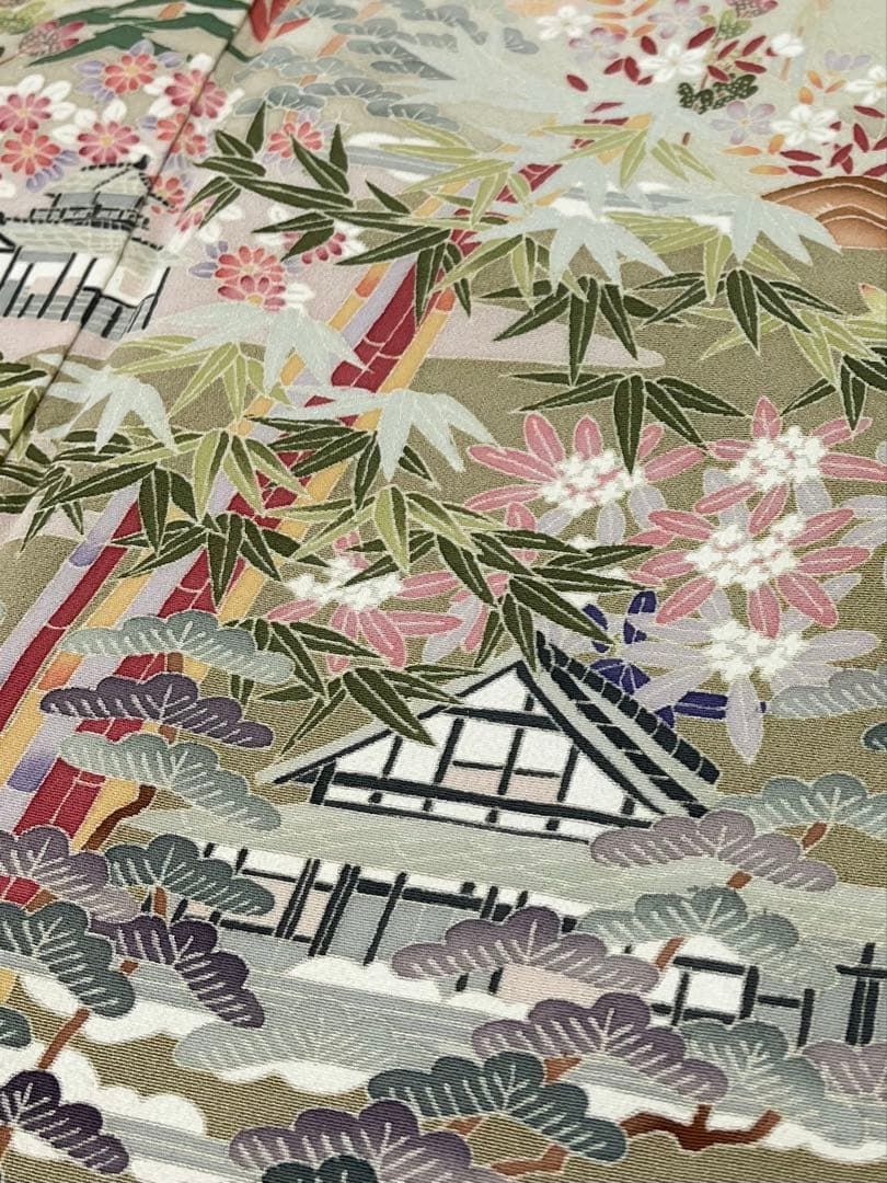 B◆着物くつろぎ 松皮に菊花模様 金糸 刺繍 萩 のりチラシ 松葉 紗綾形 袷 正絹 色留袖 襦袢セット 着物