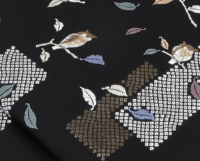 黒地に茶色やオフホワイト・オールドブルーなどの多色と金糸でミミズクや雪輪・匹田模様が柄付けされています。