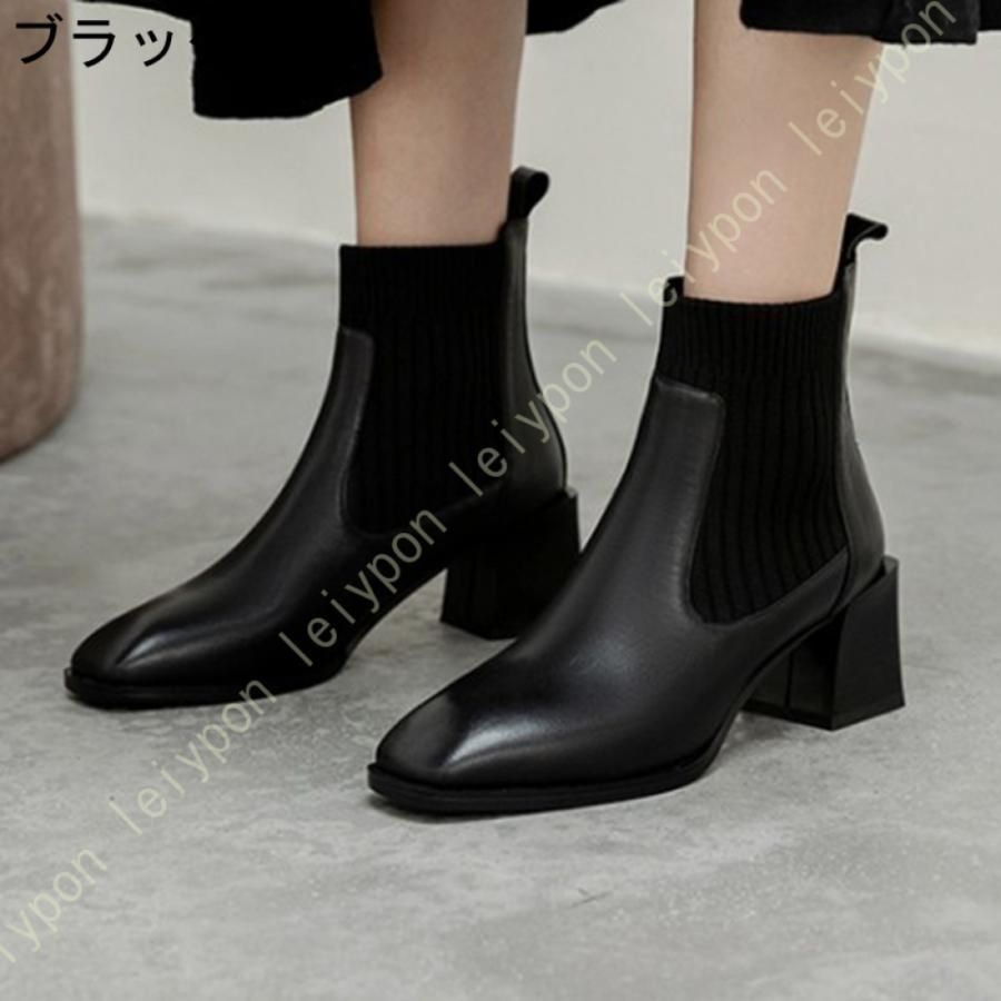 ショートブーツ レディース ブーツ ハイヒール スクエアトゥ チャンキーヒール 太ヒール ニットブーツ ソックスブーツ ミドル丈 ミディアム ミドル 秋冬 本革 WWW_NICORILABO_COM
