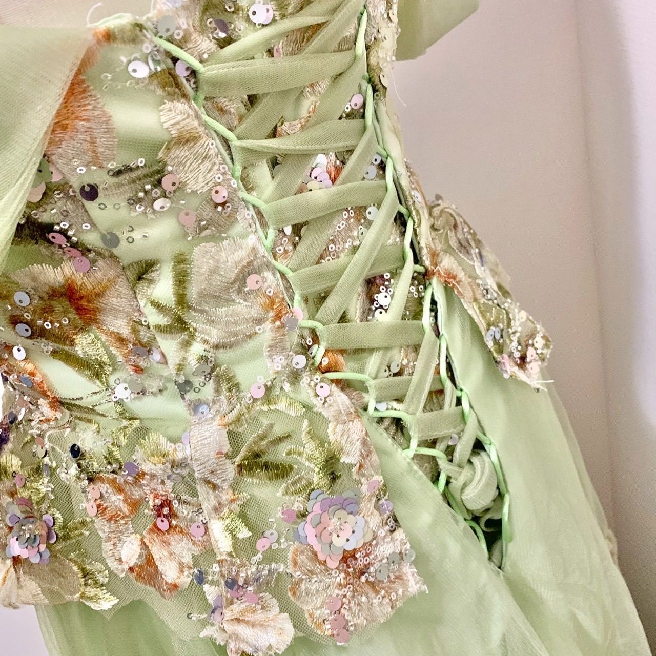 グリーン チュールドレス S 刺繍 花柄 ビジュー付き オフショルダー ボリュームスカート 演奏会 ステージドレス 発表会 ウエディング パーティーの検索結果