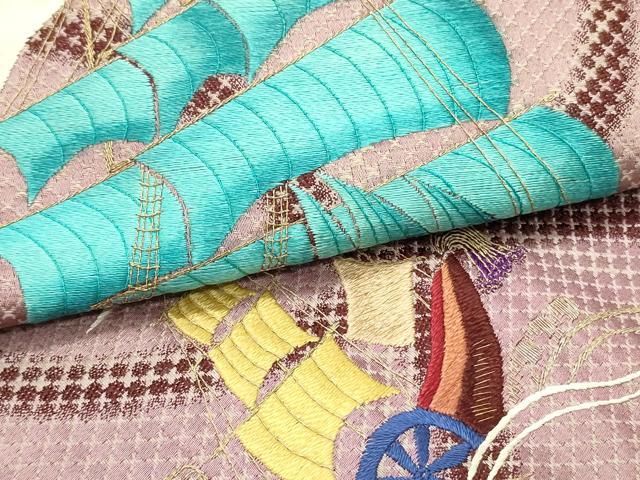 平和屋着物●アンティーク 大正ロマン 九寸名古屋帯 総手刺繍 立波帆船文 銀糸 正絹 DAAY0140obの検索結果
